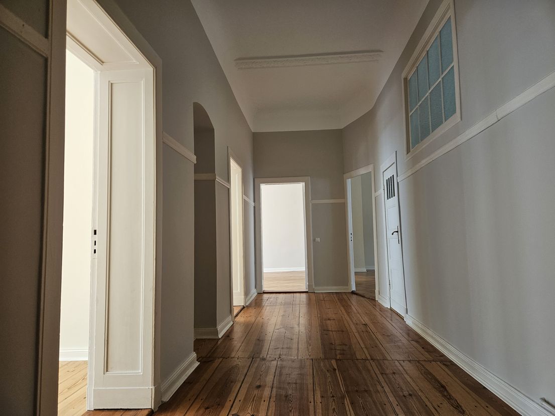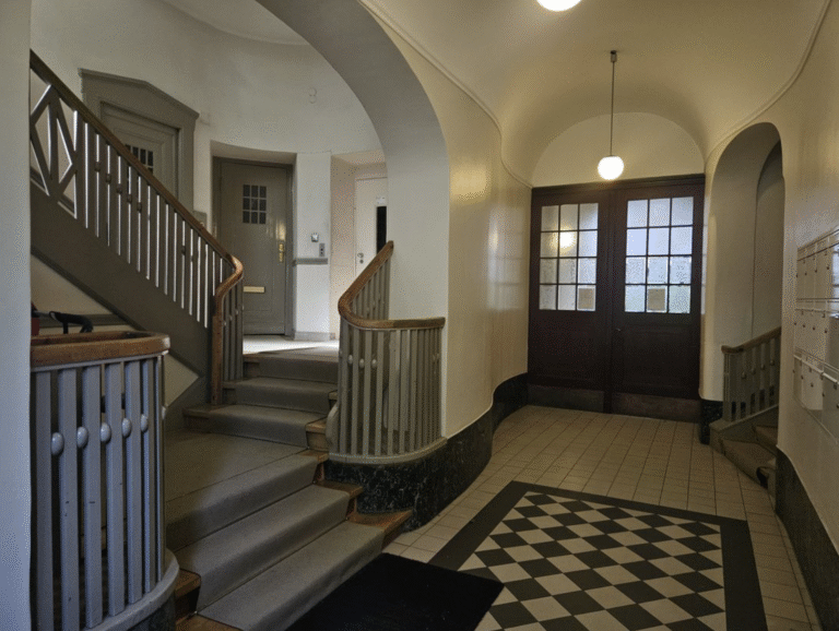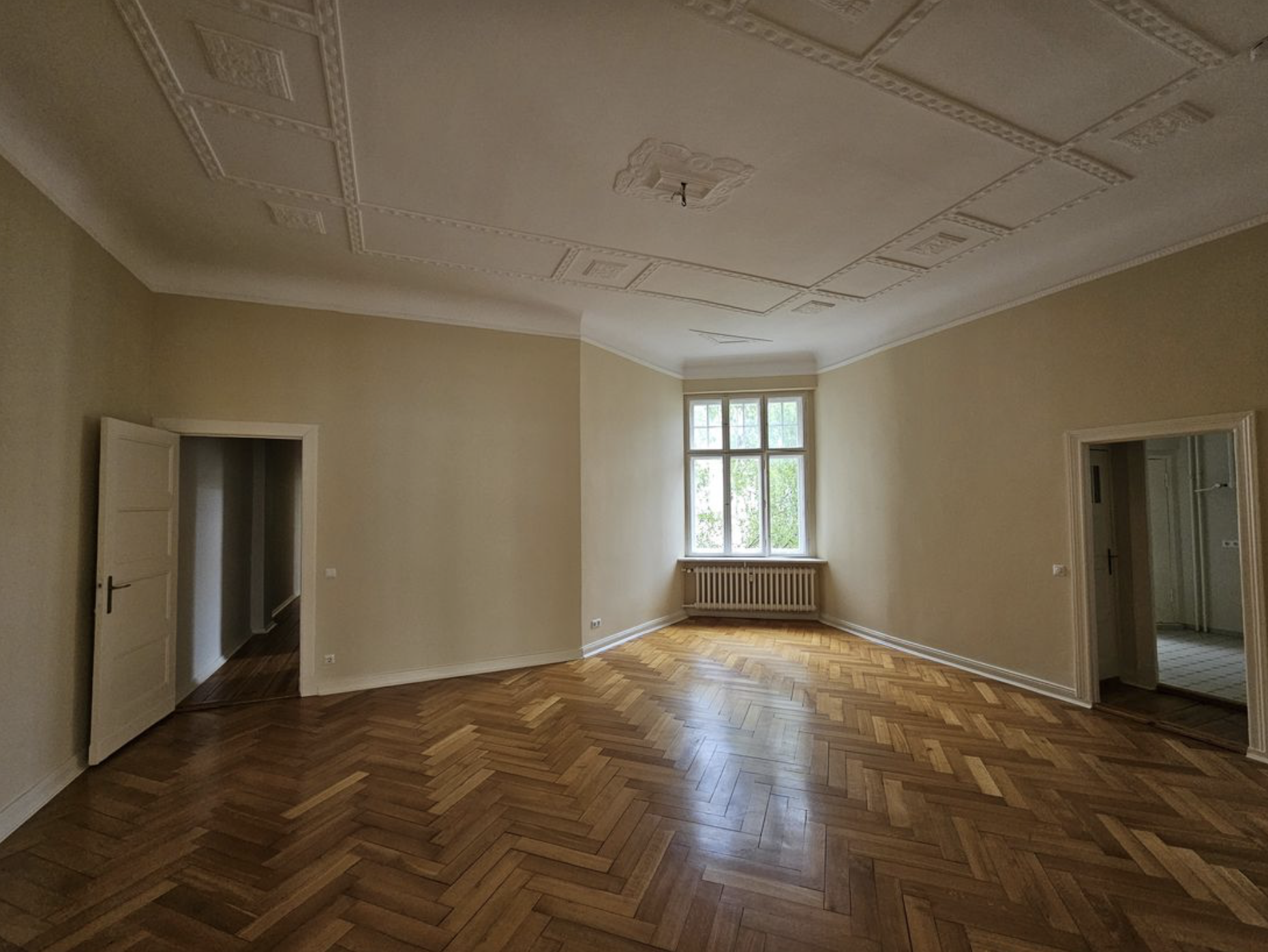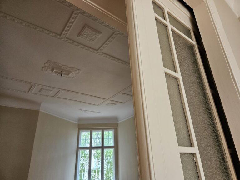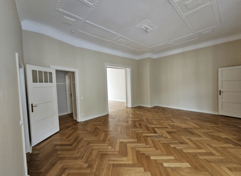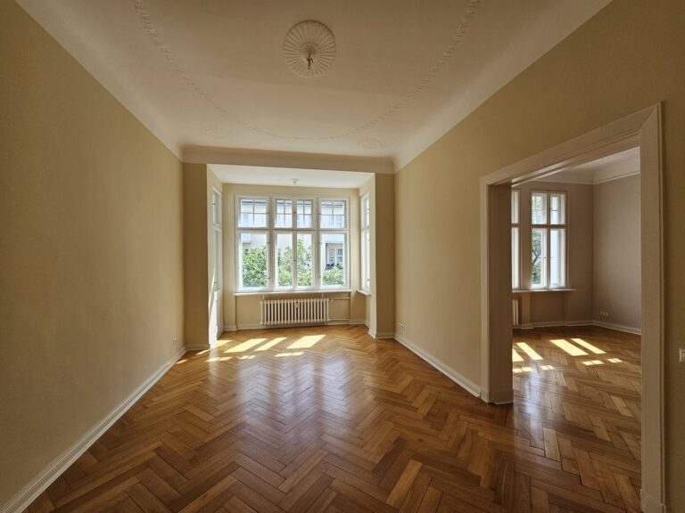 Дом, в котором расположена квартира, представляет собой тщательно сохранённый архитектурный ансамбль начала XX века. Его фасад оформлен в характерной стилистике югендстиля — с декоративной лепниной, изящными линиями и выразительными пропорциями. Интерьеры сохранили подлинные элементы декора, включая высокие потолки, штукатурную лепнину, оригинальные деревянные двери, а также паркет в классической укладке «ёлочка», что подчёркивает благородный дух объекта и создаёт ощущение времени и пространства.